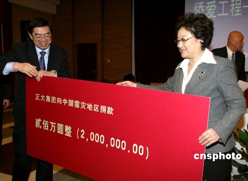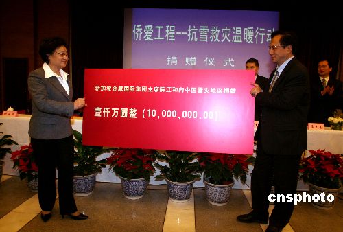 1月31日,新成立的中國(guó)僑商投資企業(yè)協(xié)會(huì)在北京發(fā)出倡議,希望廣大僑商積極行動(dòng)起來(lái),為抗雪救災(zāi)伸出援助之手,得到了來(lái)自泰國(guó)、新加坡、香港、澳門等十多家僑商投資企業(yè)的積極響應(yīng)。 中國(guó)僑商投資企業(yè)協(xié)會(huì)常務(wù)副會(huì)長(zhǎng)、新加坡金鷹國(guó)際集團(tuán)主席陳江和先生第一個(gè)對(duì)倡議作出響應(yīng)。在國(guó)務(wù)院僑辦舉行的“僑愛(ài)工程——抗雪救災(zāi)溫暖行動(dòng)”捐贈(zèng)儀式上,陳江和先生慷慨捐贈(zèng)了1000萬(wàn)元,中國(guó)僑商投資企業(yè)協(xié)會(huì)會(huì)長(zhǎng)、泰國(guó)正大集團(tuán)董事長(zhǎng)謝國(guó)民先生和中國(guó)僑商投資企業(yè)協(xié)會(huì)副會(huì)長(zhǎng)、福耀玻璃工業(yè)集團(tuán)董事局主席曹德旺先生分別捐贈(zèng)了200萬(wàn)元。目前更多善款還在匯集中。這些款項(xiàng)將通過(guò)國(guó)務(wù)院僑辦轉(zhuǎn)送受災(zāi)地區(qū)人民政府。國(guó)務(wù)院僑辦主任李海峰等出席捐贈(zèng)儀式。中新社發(fā) 張勤 攝