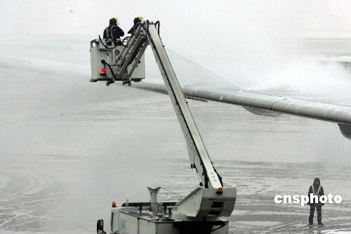 2月2日上午,2008年兩岸春節(jié)包機(jī)上海航點(diǎn)首個(gè)航班——東航MU五00七次航班,冒著數(shù)十年未遇的罕見風(fēng)雪在上海浦東機(jī)場起飛。圖為浦東機(jī)場為春節(jié)包機(jī)優(yōu)先提供特別的除冰服務(wù)。中新社發(fā) 潘索菲 攝