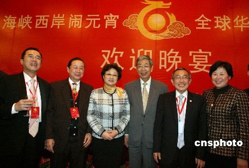 2月18日晚,中國國務(wù)院僑務(wù)辦公室、福建省人民政府和海峽兩岸關(guān)系協(xié)會在福州市舉辦晚宴,熱烈歡迎來閩參加“海峽西岸鬧元宵 全球華人盼團圓”活動的海外華僑華人、港澳同胞和臺灣同胞代表。全國人大常委會副委員長許嘉璐,國務(wù)院僑務(wù)辦公室主任李海峰,福建省人大常委會副主任王美香,福建省人民政府副省長洪捷序,福建省政協(xié)副主席張帆等出席了歡迎晚宴。圖為全國人大常委會副委員長許嘉璐、國務(wù)院僑務(wù)辦公室主任李海峰與嘉賓合影祝酒。中新社發(fā) 張勤 攝