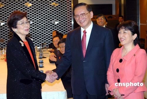 2月21日上午,正在日本進(jìn)行正式訪問(wèn)的中國(guó)國(guó)務(wù)委員唐家璇在東京會(huì)見(jiàn)日本社民黨黨首福島瑞穗等社民黨主要成員。圖為唐家璇與福島瑞穗(右)、社民黨名譽(yù)黨首土井多賀子(左)握手寒暄。中新社發(fā) 滕劍峰 攝
