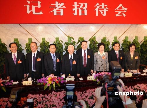 三月六日下午,全國(guó)政協(xié)十一屆一次會(huì)議記者招待會(huì)在北京人民大會(huì)堂新聞發(fā)布廳舉行,主題是“民主黨派中央主席談多黨合作”。九三學(xué)社中央主席韓啟德、農(nóng)工黨中央主席桑國(guó)衛(wèi)、民建中央主席陳昌智、民革中央主席周鐵農(nóng)、民盟中央主席蔣樹聲、民進(jìn)中央主席嚴(yán)雋琪、致公黨中央主席萬(wàn)鋼、臺(tái)盟中央主席林文漪(從左至右)共同亮相,受到中外媒體的熱烈關(guān)注。中新社發(fā) 廖攀 攝