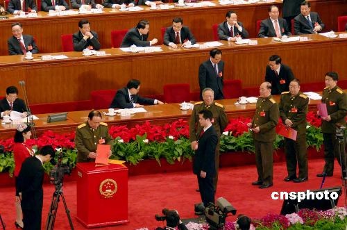 三月十五日上午,十一屆全國人大一次會議第五次全體會議在北京人民大會堂舉行,表決關(guān)于批準國務院機構(gòu)改革方案的決定草案,選舉十一屆全國人大常委會委員長、副委員長,選舉國家主席、副主席及中央軍委主席等。中新社發(fā) 王東明 攝