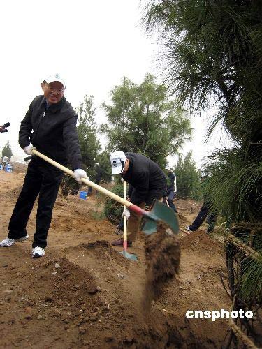 3月22日,來自中國國務(wù)院各部門的172名部級領(lǐng)導(dǎo)在北京郊區(qū)門頭溝區(qū)揮鍬鏟土,栽下了白皮松、銀杏、國槐、欒樹等30多個樹種2000多株樹木,為綠色奧運再添新綠。圖為外交部部長楊潔篪在為樹苗填土。中新社發(fā) 于立霄 攝