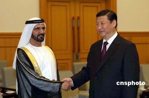 4月3日,中國國家副主席習(xí)近平在北京人民大會堂會見阿聯(lián)酋副總統(tǒng)兼總理、迪拜酋長穆罕默德。中新社發(fā) 盛佳鵬 攝