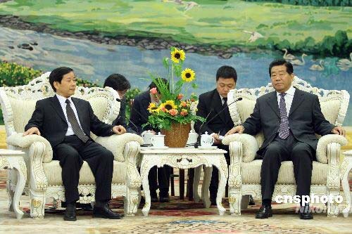 4月23日,中國全國政協(xié)主席賈慶林在北京人民大會堂會見來訪的越共中央對外部部長陳文恒。中新社發(fā) 盛佳鵬 攝