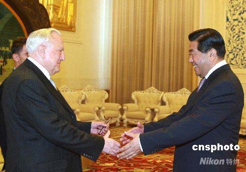 4月25日,全國政協(xié)主席賈慶林在北京人民大會堂會見法國參議院議長克里斯蒂安·蓬斯萊。中新社發(fā) 廖文靜 攝