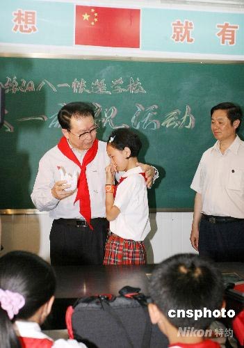 中共中央政治局常委李長春,6月1日赴四川災(zāi)區(qū)看望慰問災(zāi)區(qū)兒童,向災(zāi)區(qū)轉(zhuǎn)移安置和受傷治療的學生轉(zhuǎn)交中央宣傳文化部門贈送的十萬臺收音機和一批少兒讀物及學習用品。中新社發(fā) 蒲滔 攝