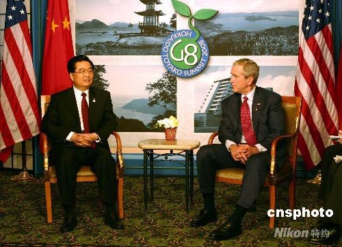正在日本北海道出席八國(guó)集團(tuán)同發(fā)展中國(guó)家領(lǐng)導(dǎo)人對(duì)話會(huì)的中國(guó)國(guó)家主席胡錦濤,當(dāng)?shù)貢r(shí)間7月9日下午會(huì)見美國(guó)總統(tǒng)布什,雙方就中美關(guān)系和其他共同關(guān)心的問題深入交換了意見。布什還表示,希望得到美國(guó)和中國(guó)的奧運(yùn)會(huì)籃球比賽的門票。他笑著對(duì)胡錦濤說(shuō):“如果您能幫我搞到票的話,我將非常感激! 中新社發(fā) 張朔 攝