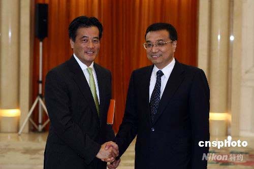 7月16日,中共中央政治局常委、國務(wù)院副總理李克強(qiáng)在北京人民大會(huì)堂會(huì)見日本民主黨副黨首岡田克也。中新社發(fā) 盛佳鵬 攝