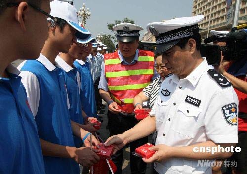 七月十九日,北京交通秩序維護社會志愿者全面上崗啟動儀式在太廟舉行。在現(xiàn)場,來自全市六百名志愿者進(jìn)行莊嚴(yán)宣誓,與會領(lǐng)導(dǎo)為志愿者授旗并佩發(fā)微笑圈。中新社發(fā) 任海霞 攝