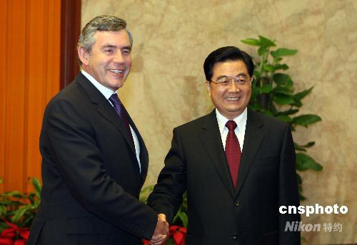 8月22日,中國國家主席胡錦濤在北京人民大會堂會見英國首相布朗。中新社發(fā) 廖文靜 攝