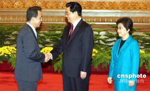 圖為胡錦濤夫婦與歡迎韓國總理韓升洙。