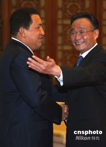 9月24日下午,中國(guó)全國(guó)人大常委會(huì)委員長(zhǎng)吳邦國(guó)在北京人民大會(huì)堂會(huì)見(jiàn)來(lái)訪(fǎng)的委內(nèi)瑞拉總統(tǒng)查韋斯。中新社發(fā) 任晨鳴 攝