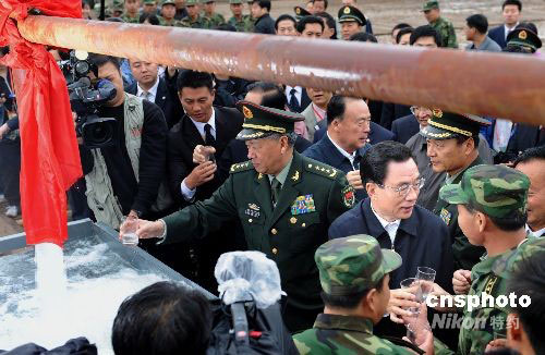 9月24日,寧夏回族自治區(qū)成立50周年慶;顒又醒氪韴F團長賀國強率一分團到固原市慰問,在寧夏軍區(qū)給水團正在打井的工地,賀國強拿起水杯同在場的民眾共同暢飲剛剛出井的“幸福水”。為幫助解決寧南山區(qū)和中部干旱帶用水困難,寧夏軍區(qū)組織給水團實施新一輪“百井支農(nóng)富民”工程,初步解決近5萬人用水問題。中新社發(fā) 廖攀 攝