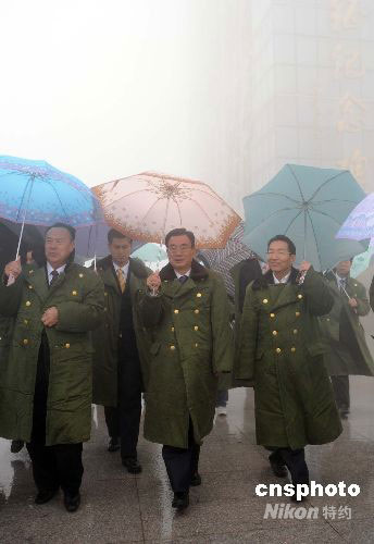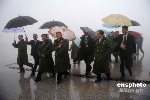 9月25日,寧夏六盤山寒雨紛飛,賀國強(qiáng)率團(tuán)冒雨參觀位于六盤山主峰上的六盤山紅軍長征紀(jì)念館。當(dāng)日,賀國強(qiáng)率中央代表團(tuán)一分團(tuán)繼續(xù)在寧夏固原市展開慰問。中新社發(fā) 廖攀 攝