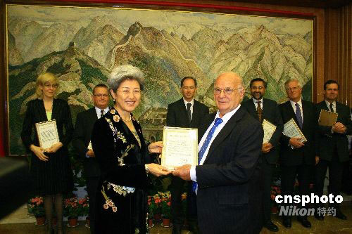 當?shù)貢r間9月25日晚,中國駐英使館舉行國慶59周年招待會。圖為中國駐英大使傅瑩(左)在招待會上向英外交部、國際發(fā)展部、英中貿(mào)協(xié)等機構代表及個人頒發(fā)中國民政部四川地震捐贈證書。中新社發(fā) 李鵬 攝