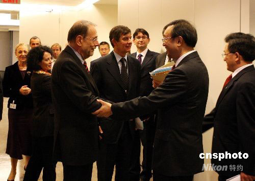 9月25日下午,中國外交部長楊潔篪在紐約與歐盟理事會秘書長兼歐盟共同對外關系與安全政策高級代表索拉納(左三)、歐盟委員會對外關系委員瓦爾德納(左一)、歐盟主席國法國外長庫什內(中)、候任主席國捷克外長施瓦岑貝格(左二)等歐盟“三駕馬車”外長舉行會晤。中新社發(fā) 李靜 攝