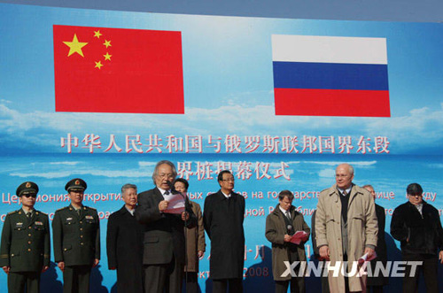 中國外交部大使趙希迪和俄羅斯外交部一亞局副局長馬雷舍夫等在中俄界樁揭幕儀式上。 新華社記者 汪永基 攝