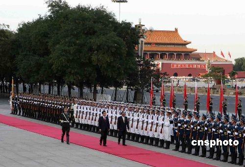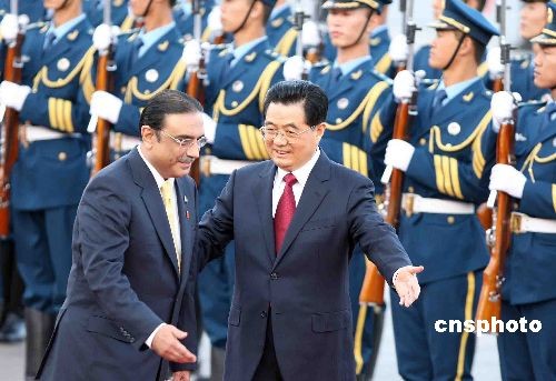10月15日下午,中國(guó)國(guó)家主席胡錦濤在北京人民大會(huì)堂東門外廣場(chǎng)舉行儀式,歡迎巴基斯坦總統(tǒng)扎爾達(dá)里訪華。扎爾達(dá)里總統(tǒng)是應(yīng)胡錦濤的邀請(qǐng)從10月14日至17日對(duì)中國(guó)進(jìn)行國(guó)事訪問(wèn),這是扎爾達(dá)里就任總統(tǒng)后的首次正式出訪。中新社發(fā) 任晨鳴 攝