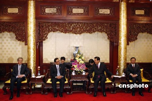 10月16日,中國(guó)全國(guó)政協(xié)主席賈慶林在北京釣魚(yú)臺(tái)國(guó)賓館會(huì)見(jiàn)巴基斯坦總統(tǒng)扎爾達(dá)里。中新社發(fā) 盛佳鵬 攝