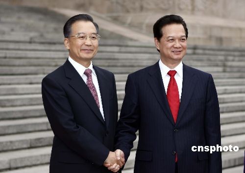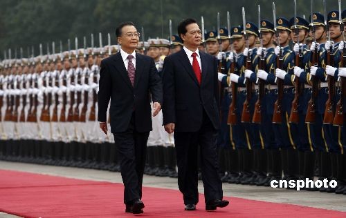 10月22日,中國國務(wù)院總理溫家寶在北京人民大會堂東門外廣場舉行儀式,歡迎越南總理阮晉勇。中新社發(fā) 盛佳鵬 攝