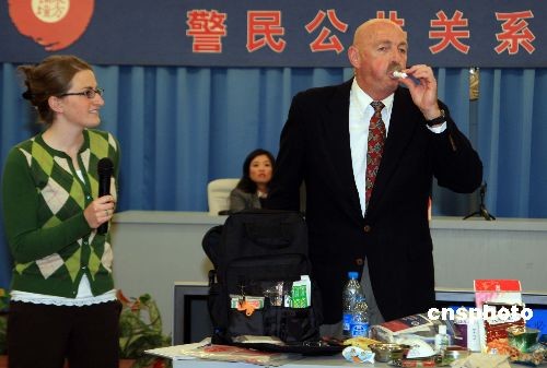 10月30日,來自美國猶他州公共安全部的資深培訓(xùn)官特德·沃雷,在上海向基層警察講解“警民公共關(guān)系”,并詳細介紹美國警察在社區(qū)微笑招呼、應(yīng)急防衛(wèi)等“秘笈”。中新社發(fā) 潘索菲 攝