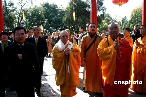11月11日,日本奈良市長藤原昭、唐招提寺長老松浦俊海率友好代表團一行,在揚州市領(lǐng)導(dǎo)陪同下拜訪揚州大明寺并舉行鑒真大和尚追思會。大明寺能修大師率兩序大眾在山門親自迎接,并舉行了隆重的歡迎儀式。中新社發(fā) 崔佳明 攝