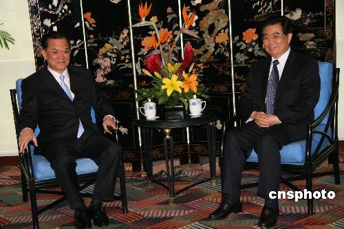 胡錦濤與夫人劉永清,當?shù)貢r間二十一日上午在秘魯首都利馬同連戰(zhàn)和夫人連方瑀會面,這是胡錦濤與連戰(zhàn)的第六次會面,也是今年以來兩人第三次會面。中新社發(fā) 齊彬 攝