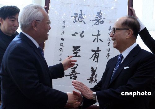 民政部長李學(xué)舉(左)向李嘉誠贈送禮品。