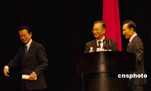 12月13日下午,首次獨立于其它國際會議而單獨舉行的中日韓三國領(lǐng)導(dǎo)人會議在日本福岡舉行。圖為中國總理溫家寶(中)、日本首相麻生太郎(左)和韓國總統(tǒng)李明博出席會議。中新社發(fā) 朱沿華 攝