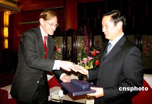 12月14日,世界銀行行長(zhǎng)佐利克一行在成都會(huì)見了四川省委書記劉奇葆,兩人就全球經(jīng)濟(jì)危機(jī)影響下雙方在四川災(zāi)后重建和成都統(tǒng)籌試驗(yàn)區(qū)建設(shè)等方面的合作意愿交流了看法。圖為佐利克(左)與劉奇葆(右)互贈(zèng)禮物。中新社發(fā) 黃永莉 攝