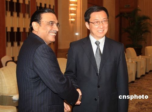 2月23日晚,上海市市長韓正在上海虹橋迎賓館會見巴基斯坦總統(tǒng)扎爾達(dá)里,韓正熱情邀請巴基斯坦總統(tǒng)參觀2010年上海世博會。中新社發(fā) 潘索菲 攝