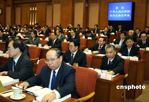 2月28日上午,十一屆全國人大常委會第七次會議在北京人民大會堂舉行閉幕會,以158票贊成、3票反對、4票棄權(quán)通過倍受關(guān)注的《中華人民共和國食品安全法》。中新社發(fā) 任晨鳴 攝
