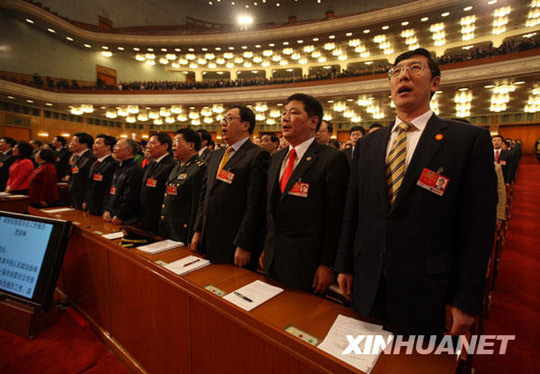 3月3日,中國人民政治協(xié)商會議第十一屆全國委員會第二次會議在北京人民大會堂開幕,全場齊唱國歌。