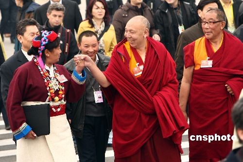 3月3日,全國(guó)政協(xié)十一屆二次會(huì)議在北京人民大會(huì)堂開幕。來(lái)自西藏的委員攜手出席會(huì)議。中新社發(fā) 杜洋 攝