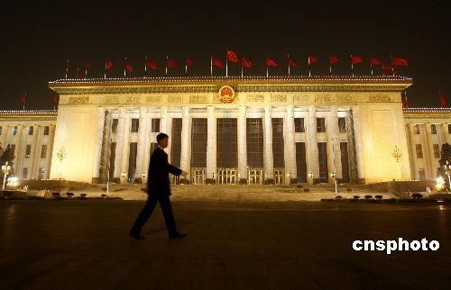 3月3日晚,北京天安門廣場紅旗飄揚(yáng),夜景璀璨迷人洋溢出一派喜慶祥和的氣氛,游客沉醉在美麗的夜色中。中新社發(fā) 鄭雄增 攝