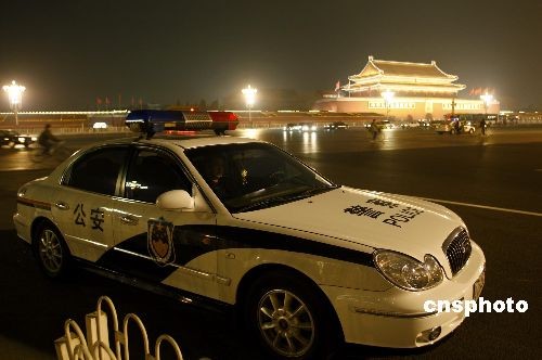 3月3日晚,北京警方在天安門(mén)廣場(chǎng)周邊加強(qiáng)夜間巡邏,確!皟蓵(huì)”安全。中新社發(fā) 鄭雄增 攝
