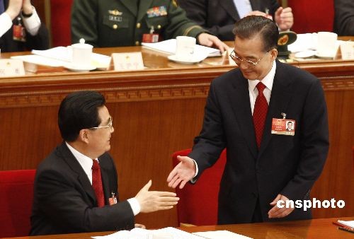 3月5日上午,十一屆全國人大二次會議在北京人民大會堂開幕,中國國家主席胡錦濤與國務院總理溫家寶互致問候。中新社發(fā) 盛佳鵬 攝
