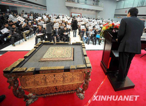 3月8日,“2008北京第29屆奧運(yùn)會(huì)開(kāi)幕式演出道具‘缶’專(zhuān)場(chǎng)拍賣(mài)會(huì)”在北京產(chǎn)權(quán)交易所落槌。首個(gè)標(biāo)的共十個(gè)缶以1.3萬(wàn)元總價(jià)起拍,經(jīng)過(guò)近百輪激烈競(jìng)價(jià),最終以70.6萬(wàn)元被347號(hào)買(mǎi)家競(jìng)得。據(jù)介紹,當(dāng)日有1000只缶約53個(gè)標(biāo)的投入競(jìng)拍,共有439家單位和個(gè)人報(bào)名參與了現(xiàn)場(chǎng)競(jìng)買(mǎi),52名競(jìng)買(mǎi)人以5244.7萬(wàn)元的總價(jià)拍走1000個(gè)奧運(yùn)缶,單個(gè)均價(jià)約5.2萬(wàn)元,較0.11萬(wàn)元的單個(gè)起拍均價(jià)而言,身價(jià)大增46倍。此次拍賣(mài)會(huì)創(chuàng)造了奧運(yùn)物資拍賣(mài)歷史上拍賣(mài)持續(xù)時(shí)間最長(zhǎng)、競(jìng)買(mǎi)人最多、競(jìng)價(jià)輪次最多、溢價(jià)率最高4個(gè)紀(jì)錄。