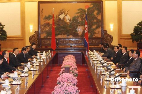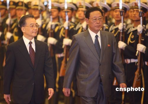 3月18日下午,中國(guó)總理溫家寶在北京人民大會(huì)堂舉行儀式,歡迎朝鮮民主主義人民共和國(guó)內(nèi)閣總理金英日訪華。中新社發(fā) 任晨鳴 攝