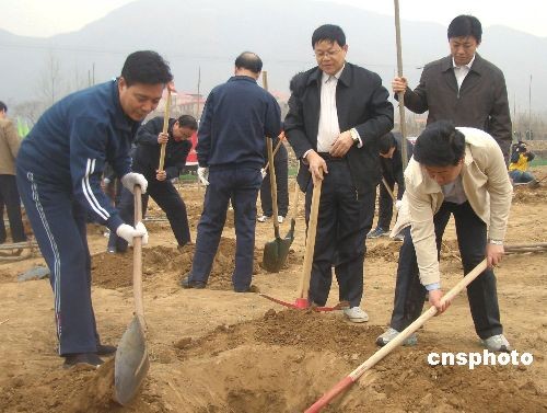 2009年3月21日,河北省及石家莊市黨政軍領(lǐng)導(dǎo)及省市四大辦公機關(guān)干部、部隊官兵1900人,在石家莊市鹿泉市山前大道韓莊生態(tài)林業(yè)基地,建設(shè)“省級領(lǐng)導(dǎo)紀念林”、“市級領(lǐng)導(dǎo)紀念林”、“駐石部隊紀念林”100多畝,栽植速生楊樹12000株,再一次掀起了省會造林綠化高潮。中新社發(fā) 俱凝搏 攝