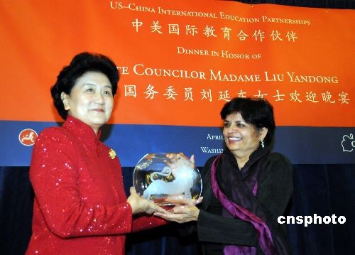 正在美國(guó)訪(fǎng)問(wèn)的國(guó)務(wù)委員劉延?xùn)|當(dāng)?shù)貢r(shí)間十六日晚出席了美亞洲協(xié)會(huì)和大學(xué)理事會(huì)聯(lián)合舉辦的晚宴,就中美關(guān)系和兩國(guó)人文交流發(fā)表講話(huà)。美亞洲協(xié)會(huì)和大學(xué)理事會(huì)還分別向劉延?xùn)|頒發(fā)各自的最高榮譽(yù)獎(jiǎng)。圖為美國(guó)亞洲協(xié)會(huì)會(huì)長(zhǎng)丁文嘉向劉延?xùn)|頒發(fā)該會(huì)最高榮譽(yù)獎(jiǎng)。中新社發(fā) 吳慶才 攝