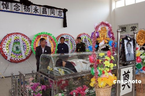 4月22日,“雪龍?zhí)枴睒O地科考船失事直升機失蹤機組人員楊永昌追悼會在上海長興島殯儀館舉行,與楊永昌生前一同到極地從事科考的隊友專程為楊永昌送行。4月12日,“雪龍?zhí)枴睒O地科考船租用的艦載直升機在完成科考任務后返回駐地時失事墜海。4名機組人員隨機落水,其中3人獲救。4月20日,經過近8天的搜尋,失蹤機組人員楊永昌的遺體在長江口水域振華港機0號碼頭附近被發(fā)現(xiàn)并打撈上岸。中新社發(fā) 潘索菲 攝