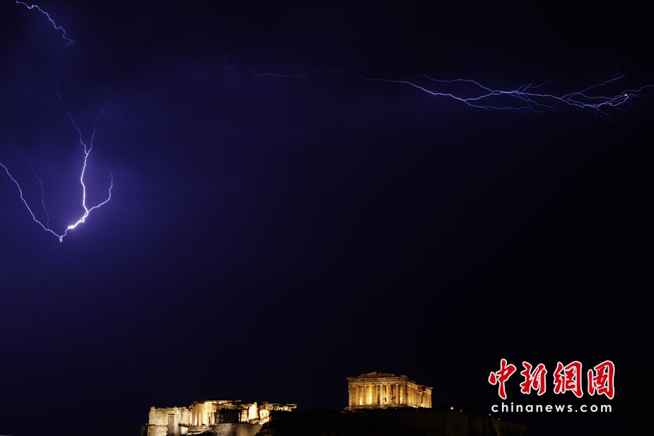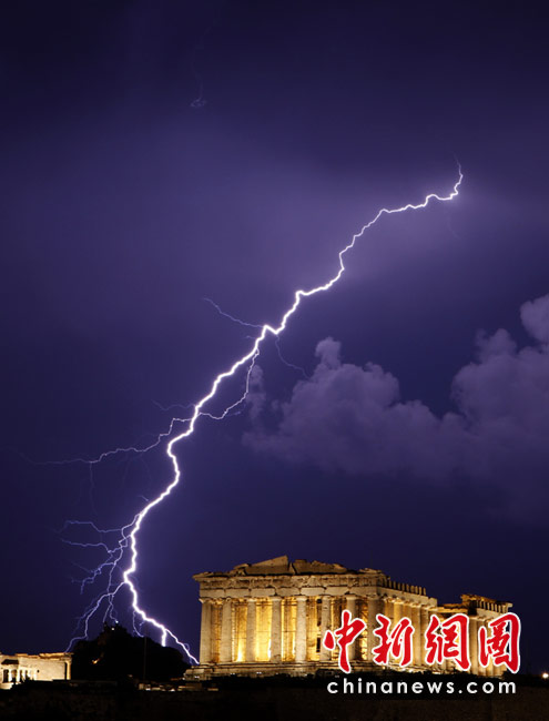 28日,在希臘雅典衛(wèi)城的上空,一道巨型閃電向具有2500年歷史的帕特農(nóng)神廟劈來,幸好沒有造成任何損失。