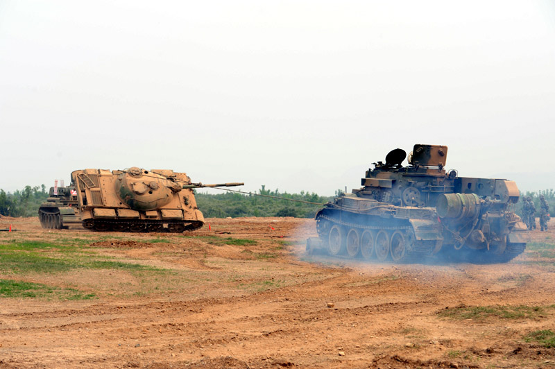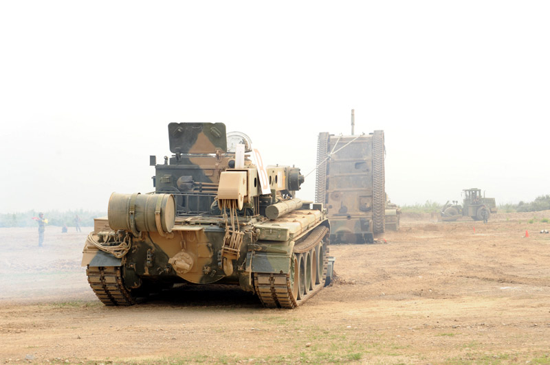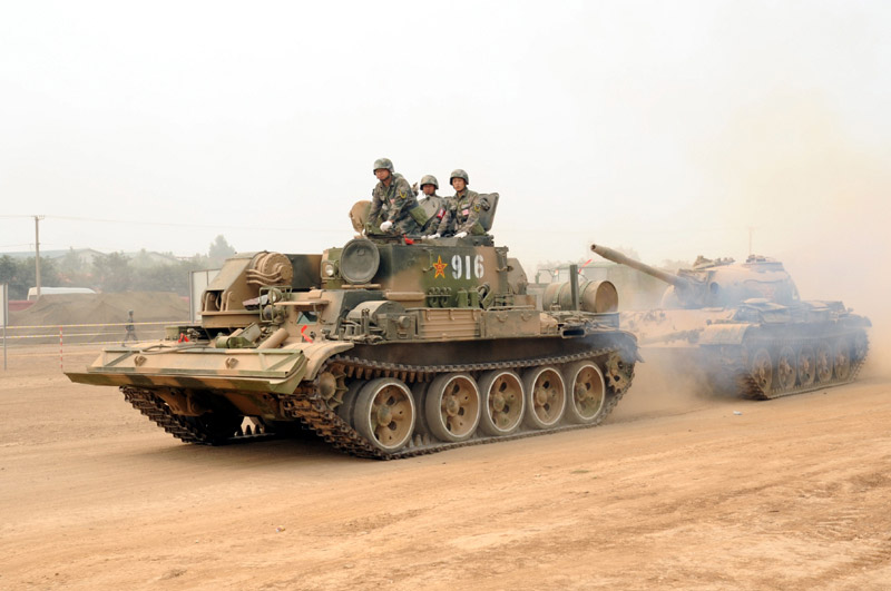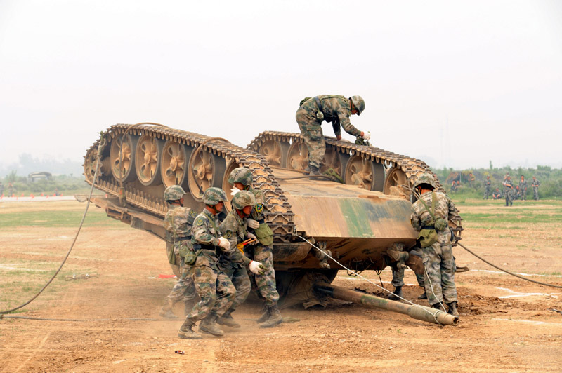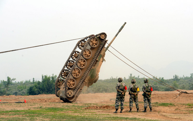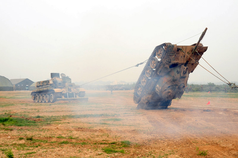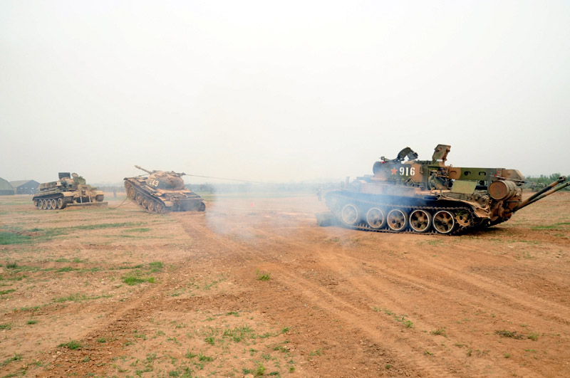 6月29日,北京軍區(qū)基礎(chǔ)比武進(jìn)入第二天,裝甲搶救車牽引訓(xùn)練坦克駛?cè)氡任洮F(xiàn)場。圖片來源:新華網(wǎng) 高航 攝