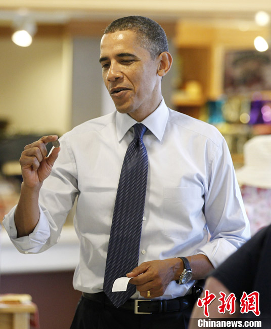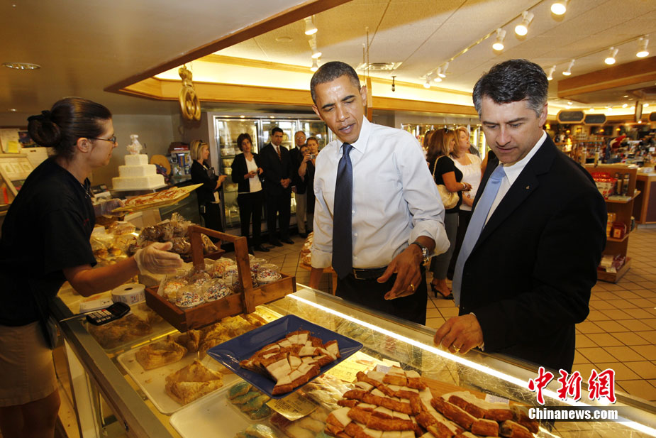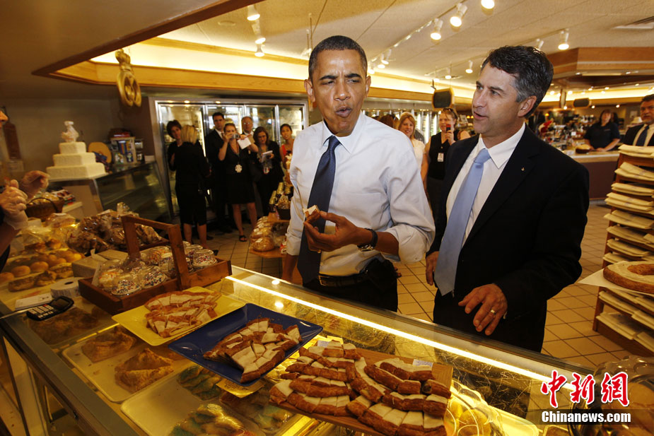 6月30日,美總統(tǒng)奧巴馬和威斯康星州拉辛市市長在前往出席市政廳會議的路上拐進一家面包店,品嘗甜點。