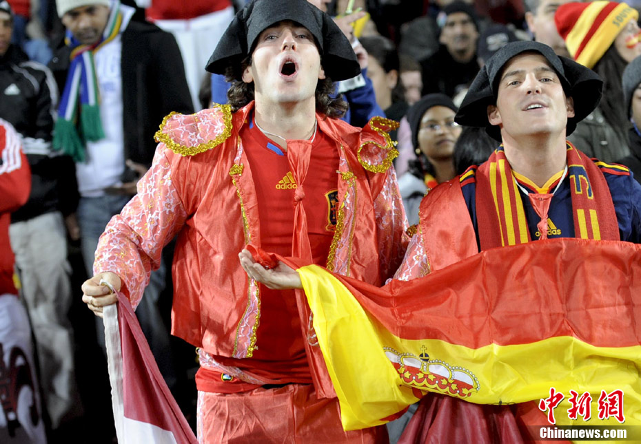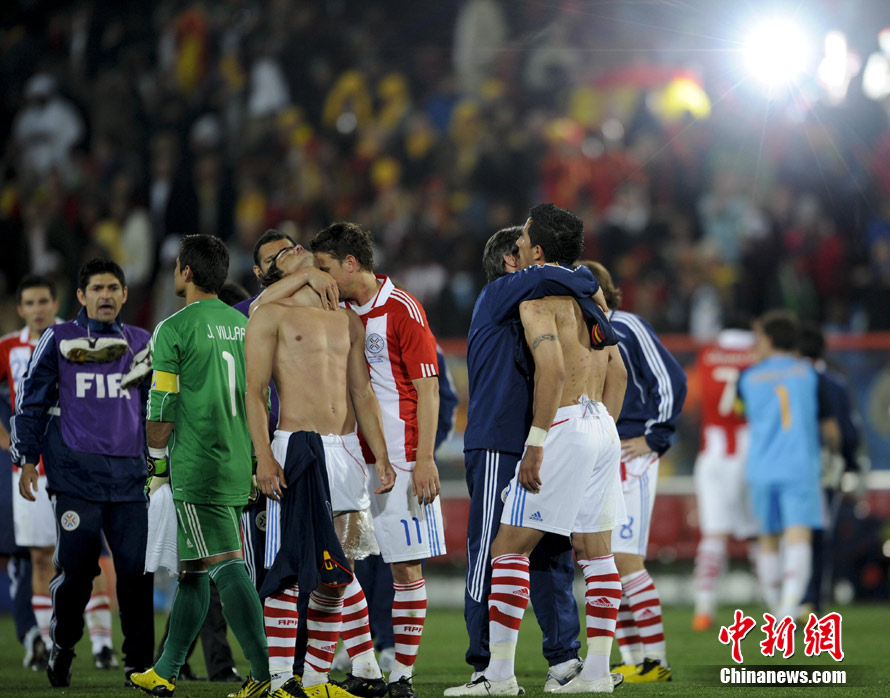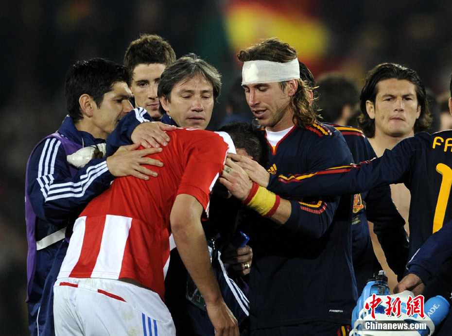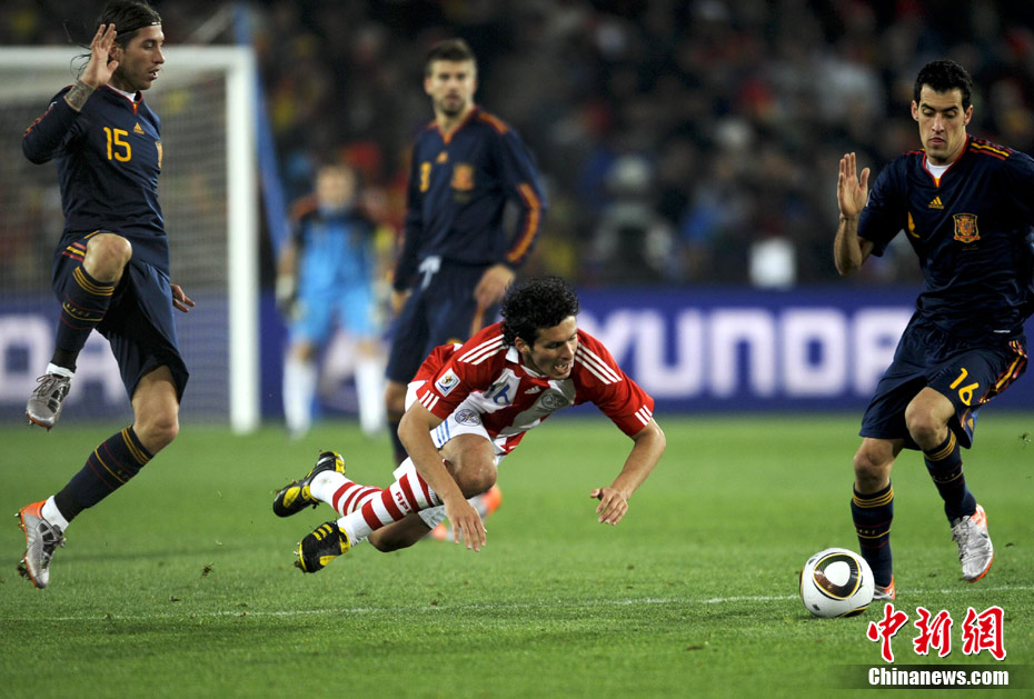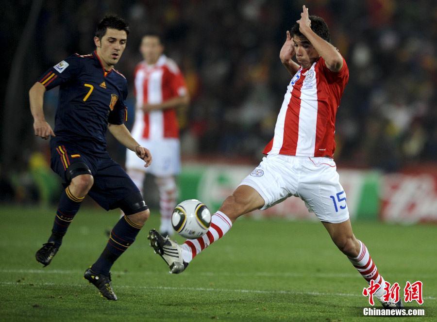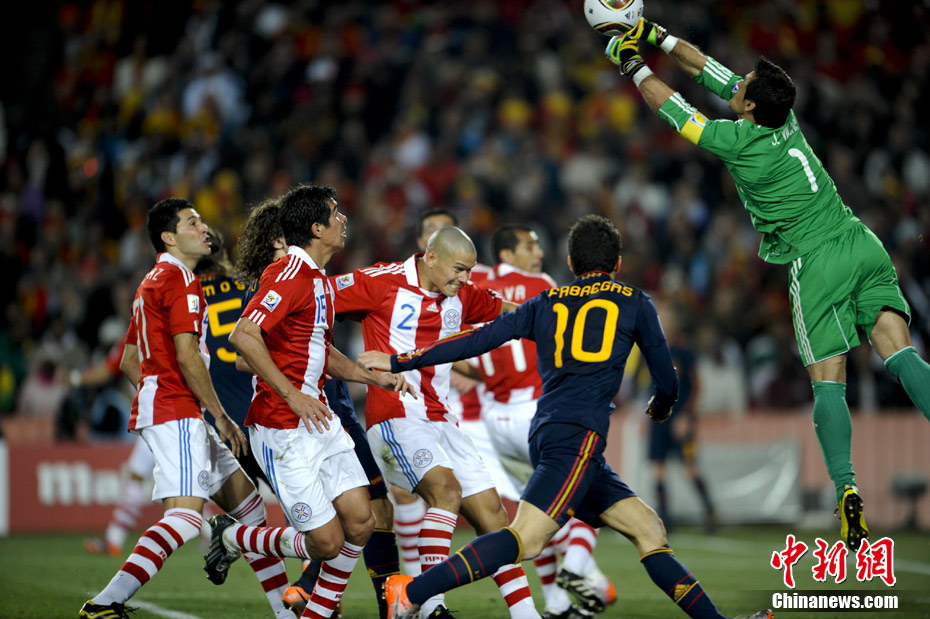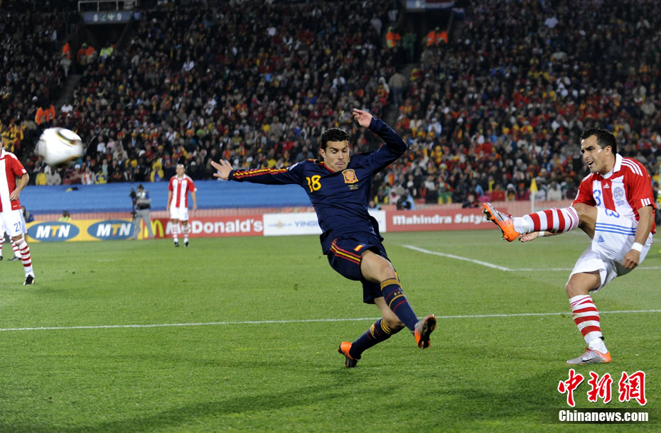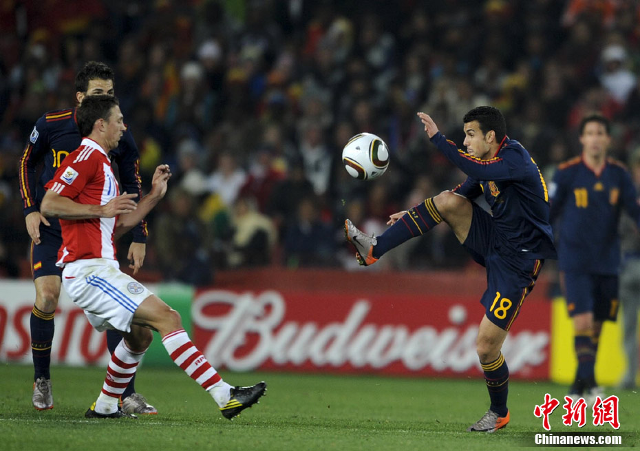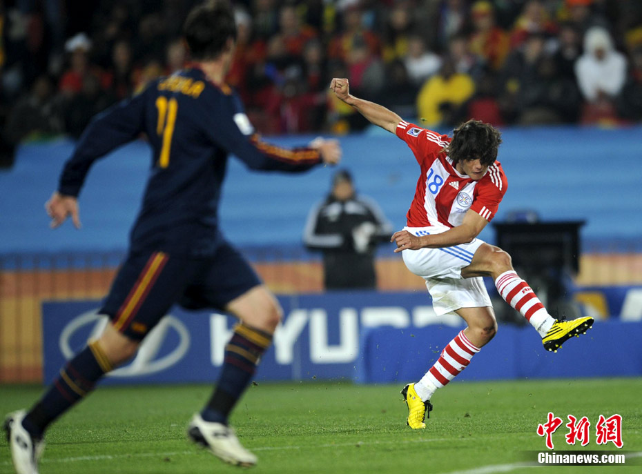 7月4日凌晨,南非世界杯最后一場(chǎng)1/4決賽打響,西班牙在約翰內(nèi)斯堡的愛麗絲公園球場(chǎng)迎來(lái)了南美勁旅巴拉圭隊(duì)。憑借比利亞在第83分鐘的進(jìn)球,西班牙1-0擊敗巴拉圭,晉級(jí)四強(qiáng)。中新社記者 廖攀 攝