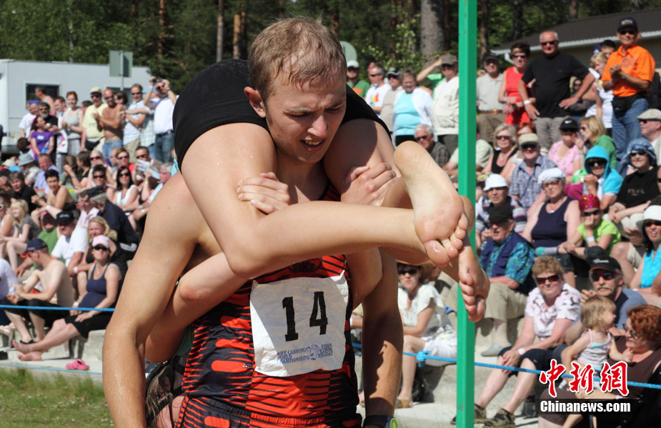 7月3日,一年的一度的世界背老婆大賽在芬蘭中部小鎮(zhèn)松卡耶爾維舉行,參賽者背著自己的老婆在泳池里行走,最終來自芬蘭的一對(duì)選手最先通過終點(diǎn)。
