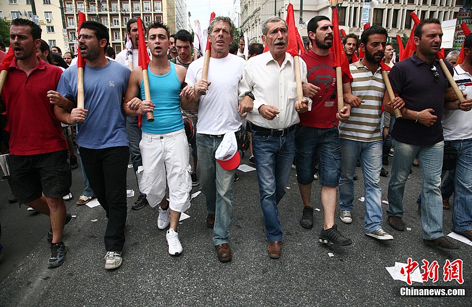 當(dāng)?shù)貢r(shí)間7月8日,希臘爆發(fā)了新一輪大罷工,抗議政府提前退休年齡,克扣養(yǎng)老金等嚴(yán)厲削減公共開支的措施。警方估計(jì),僅在首都雅典,就有1.2萬人走上街頭游行示威。據(jù)悉,這場為期24小時(shí)的罷工當(dāng)天導(dǎo)致希臘全國交通幾乎癱瘓,火車停運(yùn)、航班被迫延誤、旅游渡輪停止航行,前往希臘旅游的游客要到9日才能搭乘渡輪。政府公共機(jī)構(gòu)、學(xué)校、醫(yī)院、國營企業(yè)的正常運(yùn)營遭到沉重打擊。