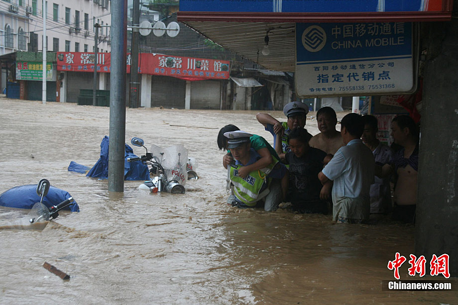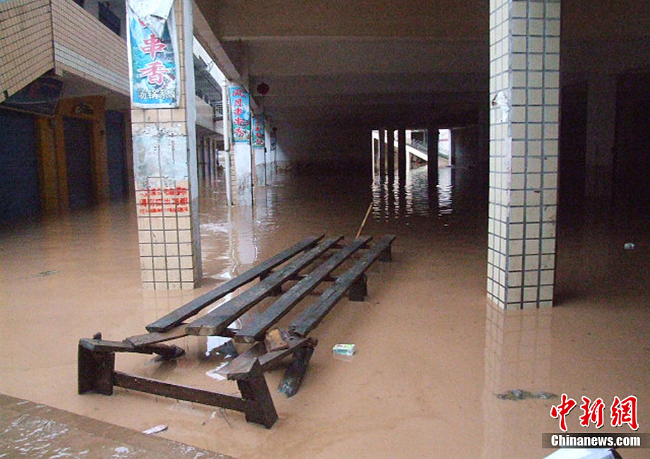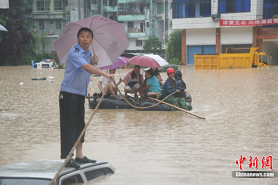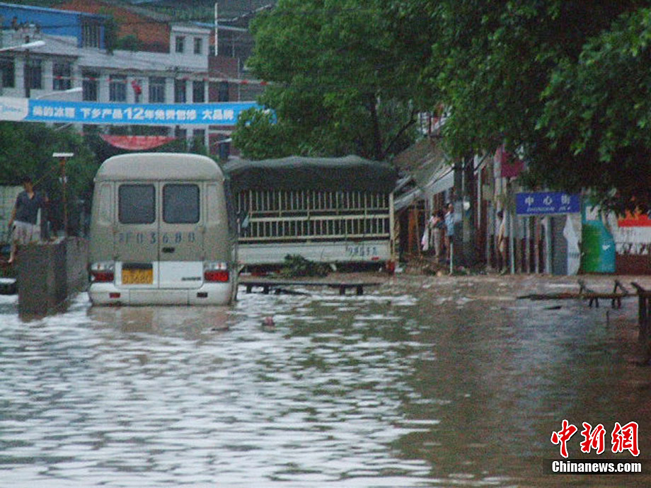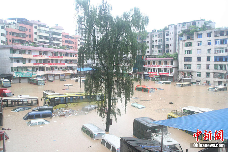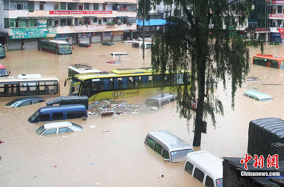 7月9日,重慶酉陽縣城一個(gè)停車場被洪水淹沒。8日21時(shí)開始,重慶市酉陽縣各地出現(xiàn)今年入汛以來最強(qiáng)降水,導(dǎo)致該縣眾多地勢較低洼地方被淹。截至9日8時(shí),該縣平均降水量達(dá)151.4毫米,目前當(dāng)?shù)亟涤耆栽诔掷m(xù)。中新社發(fā) 黃勝華 攝